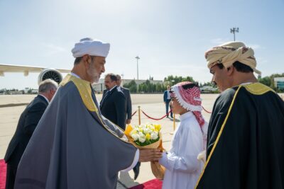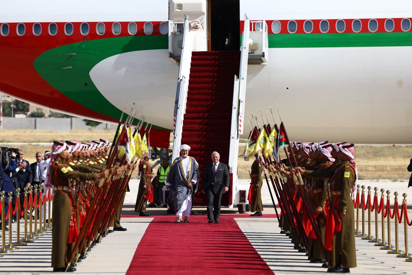 بحفظِ اللهِ ورعايته، حضرةُ صاحبِ الجلالةِ السُّلطان  هيثم بن طارق المعظّم /حفظه الله ورعاه/ يصل إلى المملكة الأردنية الهاشمية الشقيقة، وكان أخوه جلالة الملك عبدالله الثاني ابن الحسين ملك المملكة الأردنية الهاشمية في مُقدّمة المُستقبلين والمُرحّبين بجلالةِ عاهل البلاد المفدّى عند سُلّم الطائرة لدى وصوله مطار ماركا بالعاصمة عمّان.