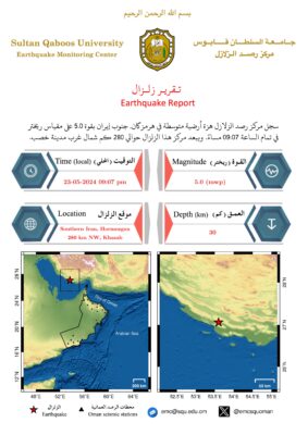 سجل مركز رصد الزلازل التابع لجامعة السلطان قابوس هزة أرضية متوسطة في هرمزگان جنوب إيران بقوة 5.0 على مقياس ريختر في تمام الساعة 09:07 مساءً.