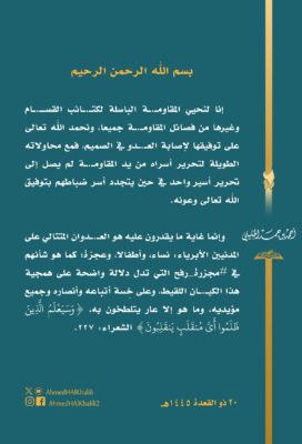 قال سماحة الشيخ احمد بن حمد الخليلي مفتي عام سلطنة عمان عبر حسابه الرسمي على موقع التواصل الاجتماعي اكس “نحيي المقاومة الباسلة، ونحمد الله تعالى على إصابتها العـدو في الصميم، فمع محاولاته الطويلة لتحرير أسراه لم يحرر أسيرا واحدا.