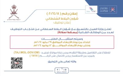 أعلنت وزارة العمل بالتنسيق مع شؤون البلاط السلطاني عن فتح باب التوظيف لعدد من الوظائف الشاغرة بمسقط، صلالة ابتداءً من اليوم الأربعاء ، وحتى يوم الأربعاء الموافق 12 يونيو المقبل.