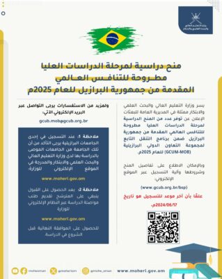 اعلنت وزارة التعليم العالي والبحث العلمي والابتكار ممثلة في المديرية العامة للبعثات الإعلان عن توفر عدد من المنح الدراسية المرحلة الدراسات العليا مطروحة للتنافس العالمي المقدمة من جمهورية البرازيل ضمن برنامج التنقل التابع المجموعة التعاون الدولي البرازيلية )GCUM-MOB( .للعام 2025م