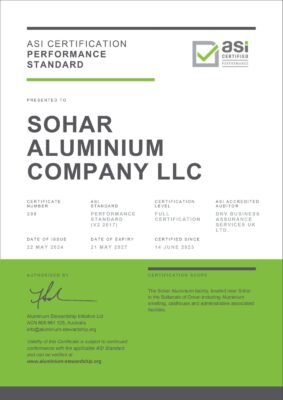 حصلت صحار ألمنيوم على الشهادة الكاملة في معيار الأداء النسخة الثانية من مبادرة الإشراف على الألمنيوم، وهي مؤسسة غير ربحية تضع المعايير وتمنح شهادات في مجال سلسلة قيمة الألمنيوم. وقد تم إجراء عمليات التدقيق للحصول على هذه الشهادة وفقًا لمعيار الأداء لمصهر ومسبك صحار ألمنيوم.