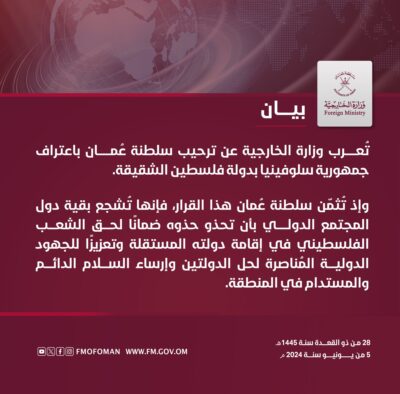 وإذ تُثمّن سلطنة عُمان هذا القرار، فإنها تُشجع بقية دول المجتمع الدولي بأن تحذو حذوه ضمانًا لحق الشعب الفلسطيني في إقامة دولته المستقلة،