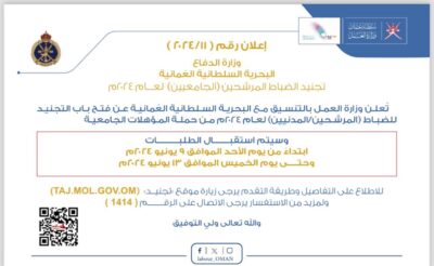 اعلنت وزارة العمل بالتنسيق مع البحرية السلطانية العُمانية عن فتح باب التجنيد للضباط ( المرشحين / المدنيين ) لحملة المؤهلات الجامعية وذلك ابتداءً من يوم الأحد الموافق 9 يونيو 2024م،وحتى يوم الخمييس الموافق 13 يونيو 2024م.