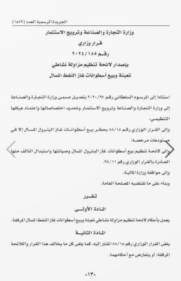 أصدرت وزارة التجارة والصناعة وترويج الاستثمار قرار وزاري رقم ١٨٥ / ٢٠٢٤ بإصدار لائحة تنظيم مزاولة نشاطي تعبئة وبيع أسطوانات غاز النفط المسال كما هو موضح ادناه :