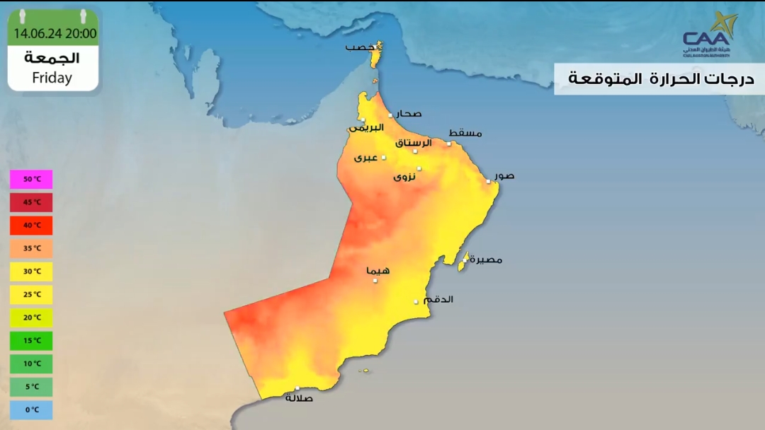 أعلنت هيئة الأرصاد الجوية عبر حسابها الرسمي على موقع التواصل الاجتماعي اكس توقعات بارتفاع درجات الحرارة تدريجيًا ابتداءً من يوم الغد الثلاثاء 11 يونيو 2024م على أن تتراوح درجات الحرارة العظمى بين منتصف ونهاية الأربعين خلال عطلة نهاية الأسبوع على المناطق الساحلية من بحر عمان وأجزاء من المناطق الصحراوية من محافظات الظاهرة والوسطى وظفار