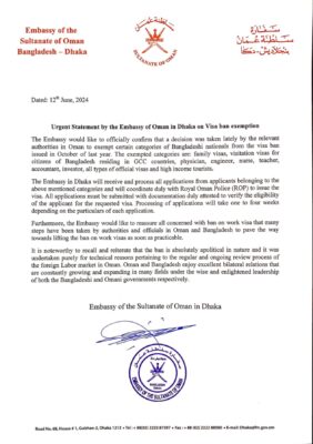 وأكدت السفارة أن القرار قد تم اتخاذه مؤخرًا من قبل الجهات المعنية في سلطنة عُمان لإعفاء فئات معينة من المواطنين البنغلاديشيين من حظر التأشيرة الصادر في أكتوبر من العام الماضي.
