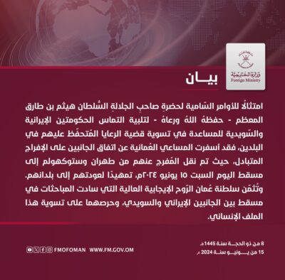 اصدرت وزارة الخارجية العمانية بيانا عبر حسابها الرسمي على موقع التواصل الاجتماعي اكس فيما يلي نصه :- “امتثالاً للأوامر السامية لحضرة صاحب الجلالة السلطان هيثم بن طارق المعظم – حفظه الله ورعاه – لتلبية التماس الحكومتين الإيرانية والسويدية للمساعدة في تسوية قضية الرعايا المتحفظ عليهم في البلدين، فقد أسفرت المساعي العُمانية عن اتفاق الجانبين على الإفراج المتبادل، حيث تم نقل المفرج عنهم من طهران وستوكهولم إلى مسقط اليوم السبت ١٥ يونيو ٢٠٢٤م، تمهيدًا لعودتهم إلى بلدانهم. وتثمن سلطنة عُمان الروح الإيجابية العالية التي سادت المباحثات في مسقط بين الجانبين الإيراني والسويدي، وحرصهما على تسوية هذا الملف الإنساني”.