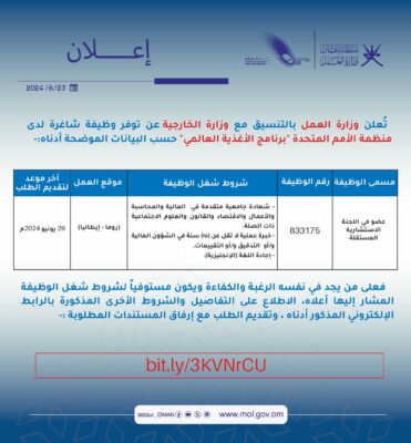 أعلنت وزارة العمل بالتنسيق مع وزارة الخارجية عن توفر وظيفة شاغرة لدى منظمة الأمم المتحدة “برنامج الأغذية العالمي حسب البيانات المحددة أدناه،فعلى من يجد في نفسه الرغبة لشغل الوظيفة؛ تقديم الطلب عبر الرابط التالي :