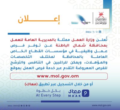 تُعلن ⁧‫وزارة العمل‬⁩ ممثلة بالمديرية العامة للعمل في محافظة شمال الباطنة عن توفر فرص عمل وظيفية في مؤسسات القطاع الخاص العاملة بالمحافظة لمختلف التخصصات والمؤهلات، للاطلاع وللتسجيل في فرص العمل المعروضة يُرجى التقدم عبر خدمة فرص العمل او عبر تطبيق معاك