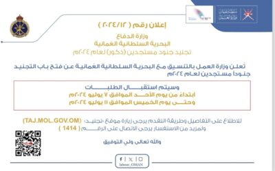 أعلنت وزارة العمل بالتنسيق مع البحرية السلطانية العُمانية عن فتح باب التجنيد جنوداً مستجدين (ذكور) لعام 2024م، وذلك ابتداءً من يوم الأحد الموافق 7 يوليو 2024م، وحتى يوم الخميس الموافق 11 يوليو 2024م، للتفاصيل والتسجيل على الرابط التالي:-