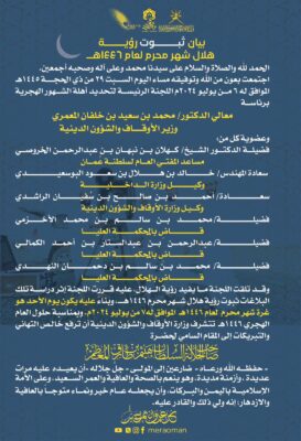وهج الخليج - مسقط اصدرت وزارة الأوقاف والشؤون الدينية عبر حسابها الرسمي على موقع التواصل الاجتماعي اكس بياناً بثبوت رؤية هلال شهر محرم لعام 1446هـ، وعليه يكون غدًا الأحد أوّل أيام شهر محرم.