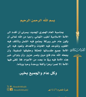 سماحة الشيخ الخليلي: بمناسبة العام الهجري الجديد نتمنى ان تعود إلى الأمة جميع مقدساتها المحتلة وحقوقها المسلوبة
