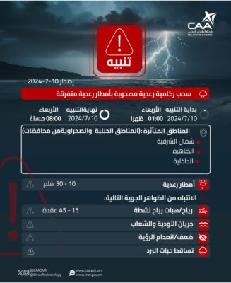 أصدرت الارصاد الجوية تنبيه حول وجود فرص نشاط السحب الركامية على جبال الحجر والمناطق المجاورة لها تمتد للصحاري لاحقاً اليوم (الأربعاء) مع فرص هطول أمطار رعدية أحيانًا مصحوبة برياح هابطة نشطة وتساقط البرد وجريان الأودية والشعاب خلال الظهيرة والمساء