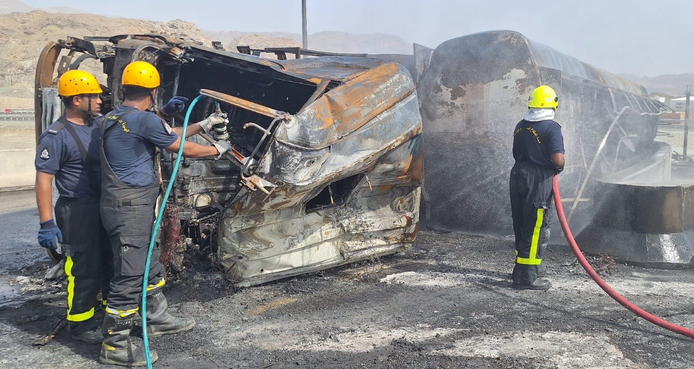 الدفاع المدني والإسعاف : وفاة سائق ناقلة الوقود بسبب تدهورها واشتعالها