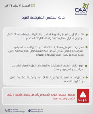 أصدرت الأرصاد الجوية ملخص حالة الطقس لليوم كما هو موضح ادناه :