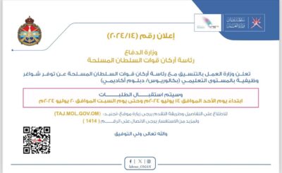 اعلنت وزارة العمل بالتنسيق مع رئاسة أركان قوات السلطان المسلحة عن توفر شواغر وظيفية لعام ٢٠٢٤م، وذلك ابتداءً من يوم الأحد الموافق 14 يوليو 2024م،وحتى يوم السبت الموافق 20 يوليو 2024م.