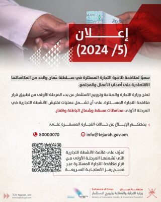 أعلنت وزارة التجارة والصناعة وترويج الاستثمار عن بدء المرحلة الأولى من تطبيق قرار مكافحة التجارة المستترة، على أن تشمل عمليات تفتيش الأنشطة التجارية في المرحلة الأولى محافظات مسقط وشمال الباطنة وظفار.