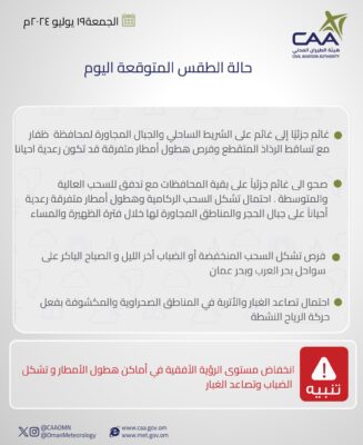 وهج الخليج - مسقط أصدرت الأرصاد الجوية ملخص حالة الطقس اليوم كما هو موضح أدناه :