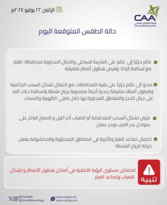 وهج الخليج - مسقط أصدرت الارصاد الجوية ملخص حال الطقس لليوم كما هو موضح ادناه :