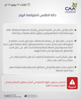وهج الخليج - مسقط أصدرت الأرصاد الجوية ملخص حالة الطقس لليوم كما هو موضح ادناه :