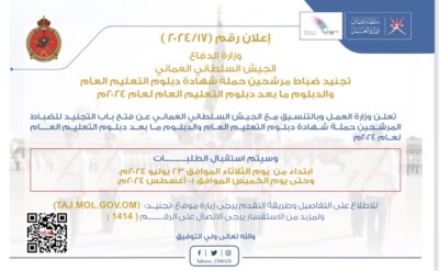 تُعلن ⁧‫وزارة العمل‬⁩ بالتنسيق مع الجيش السلطاني العُماني ‬⁩عن فتح باب التجنيد للضباط المرشحين(دبلوم التعليم العام والدبلوم الأكاديمي)، ابتداءً من اليوم الثلاثاء الموافق 23يوليو ،وحتى يوم الخميس الموافق 1 أغسطس . للتسجيل عبر الرابط الآتي :