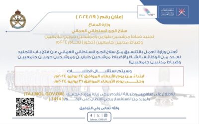 اعلنت وزارة العمل بالتنسيق مع سلاح الجو السلطاني العُماني عن فتح باب التجنيد ضباط مرشحين طيارين، ومرشحين جويين جامعيين، ومرشحين مدنيين جامعيين(ذكور).
