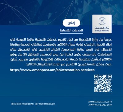 أصدرت وزارة الخارجية عبر حسابها الرسمي على موقع التواصل الاجتماعي اكس تنويه للراغبين في التصديق على المعاملات بأنه سوف يكون اعتبارا من يوم الخميس الموافق 25 من يوليو 2024م تدشين منظومة خدمة التصديقات إلكترونيا بالتعاون مع بريد عمان