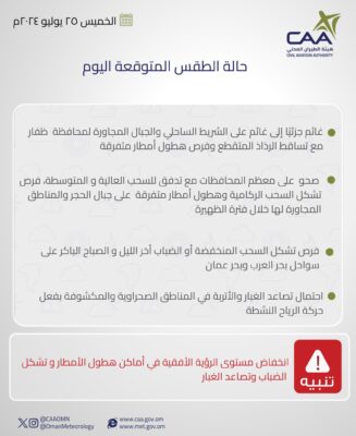وهج الخليج - مسقط أصدرت الارصاد الجوية ملخص حالة الطقس لليوم الخميس كما هو موضح ادناه :