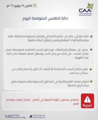 وهج الخليج - مسقط أصدرت الأرصاد الجوية العمانية ملخص حالة الطقس لليوم كما هو موضح ادناه :
