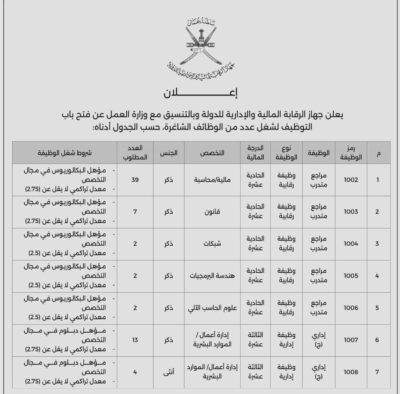 للباحثين عن عمل .. مجموعة من الوظائف الشاغرة لدى جهاز الرقابة