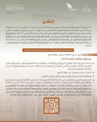 اعلنت وزارة التربية والتعليم عن توفر عدد من الشواغر في تخصص اللغة الإنجليزية (الذكور) المتوقع تخرجهم في العام الاكاديمي ٢٠٢٣/ ٢٠٢٤م حسب الإعلان التالي:-