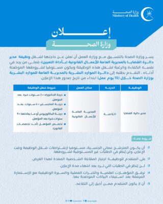 أعلنت وزارة الصحة بالتنسيق مع وزارة العمل عن حاجتها لشغل وظيفة مدير دائرة القضايا بالمديرية العامة للأعمال القانونية بأداة التعيين)، فعلى من يجد في نفسه الكفاءة والرغبة لشغل هذه الوظيفة ويكون مستوفيا لشروطها الموضحة أدناه ، التقدم بطلبه إلى دائرة الموارد البشرية بالمديرية العامة للموارد البشرية بوزارة الصحة خلال 15 يوم عمل ابتداء من تاريخ صدور هذا الإعلان.