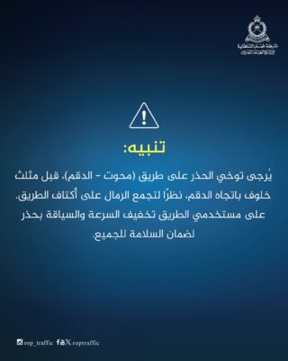 اعلنت الإدارة العامة للمرور عبر حسابها الرسمي على موقع التواصل الاجتماعي اكس تنبيها بضرورة توخي الحذر على طريق “محوت – الدقم”، قبل مثلث خلوف باتجاه الدقم، نظرًا لتجمع الرمال على أكتاف الطريق.