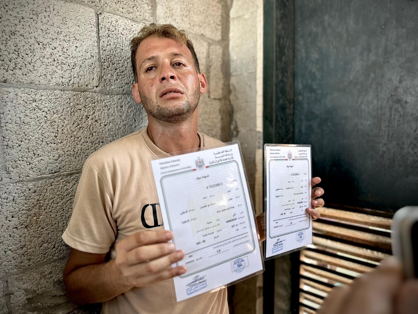 خرج محمد أبو القمصان من منزله في دير البلح في قطاع غزة لاستخراج شهادتي ميلاد لتوأميه المولودين السبت الماضي وعاد لتوديعهما في ثلاجة الموتى التي نقلا اليها مع والدتهما وجدتهما بعد قصف طال المنزل واغتالهم جميعا. ويقول أبو القمصان لوكالة الأنباء الفرنسية “كنت ذاهبا لاستخراج شهادتي الميلاد. ولدا في 10 أغسطس 2024”. ويضيف أبو القمصان من خيمة أوى اليها في منطقة المواصي “كانت شهادتا الميلاد في يدي، كانت زوجتي تريد أن تسميهما آسر (الصبي) وآيسل (البنت)، وكنت عائدا لأريها الوثيقتين”. ويتابع وهو يحاول حبس دموعه “لكن قيل لي إنها في ثلاجة الموتى”.