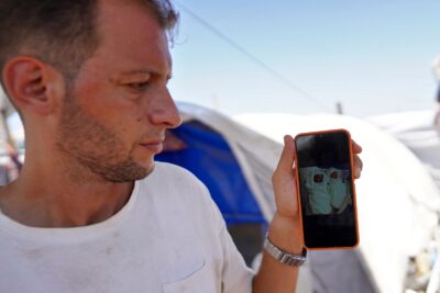 ويقول أبو القمصان الذي انتشرت مقاطع فيديو وثّقت قصته بعد تلقيه نبأ مقتل توأمه وزوجته بشكل واسع على منصات التواصل الاجتماعي “لم أتمكن من رؤية الجثث”. وينظر بحزن وهو جالس أمام خيمته الزرقاء، الى شهادتي الميلاد وملابس التوأمين التي نجت من القصف والى كيس حفاضات. ويقول وهو يحمل ملابس زهرية، “هذه كانت لآيسل”، قبل أن يضع شهادتي الميلاد فوق ملابس أخرى صفراء زُيّنت بالأقحوان الأبيض.