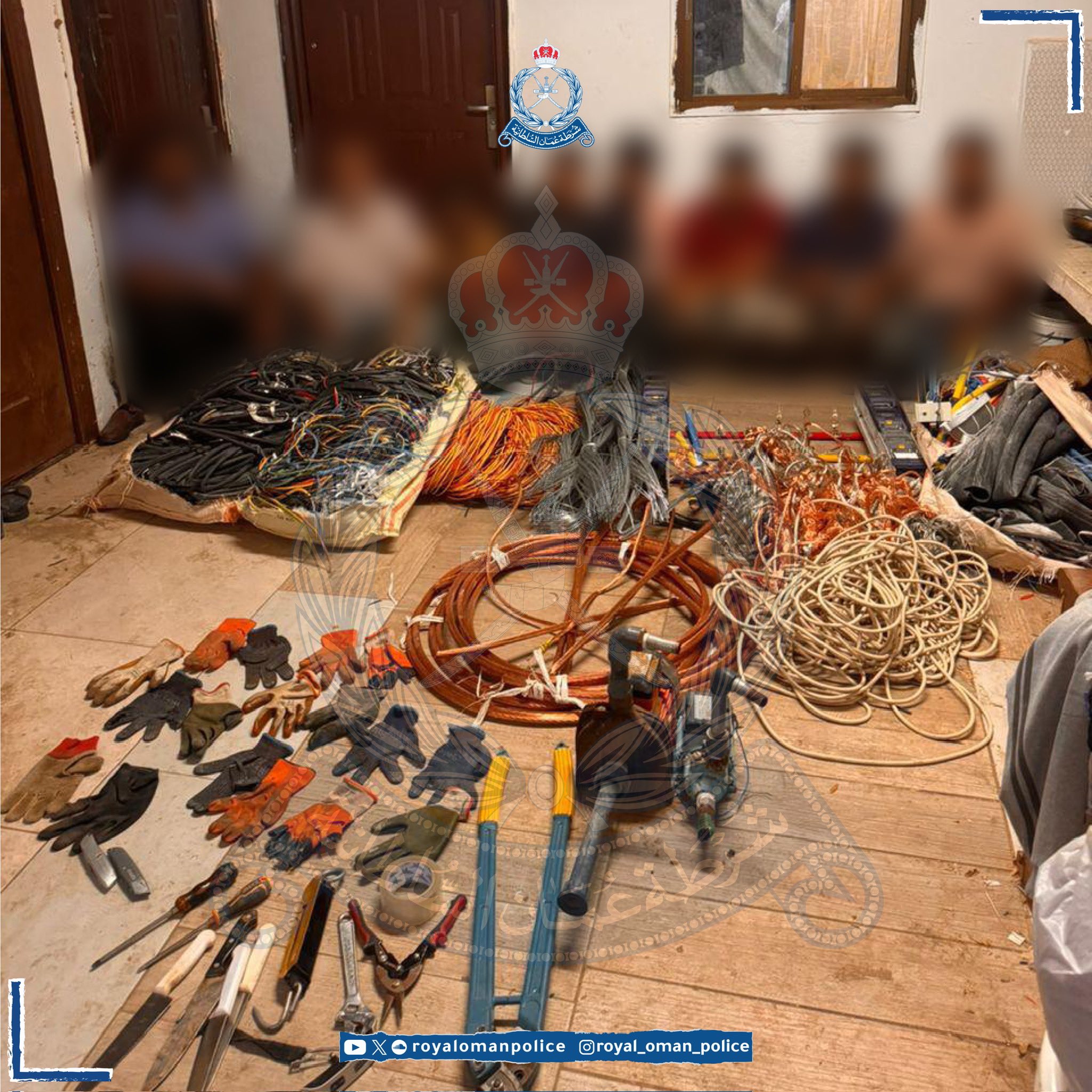 ألقت قيادة شرطة محافظة مسقط القبض على 8 أشخاص من جنسيات آسيوية لقيامهم بسرقة كابلات وأسلاك وقطع للمولدات الكهربائية من عدة منازل قيد الإنشاء في محافظتي مسقط وجنوب الباطنة، وتُستكمل الإجراءات القانونية بحقهم.
