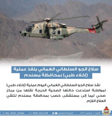 وهج الخليج ـ مسقط نقذ سلاح الجو السلطاني العُماني اليوم عملية إخلاء طبي ) لمواطنة استدعت حالتها الصحية الحرجة نقلها من مركز صحي ليما إلى مستشفى خصب بمحافظة مسندم لتلقي