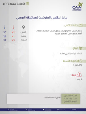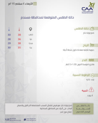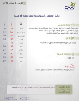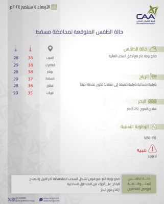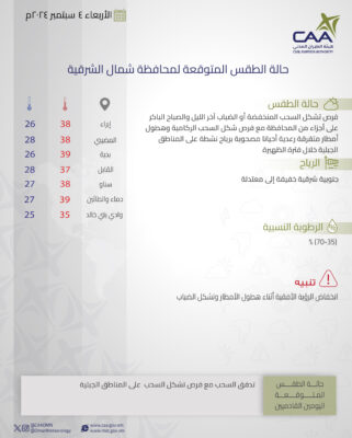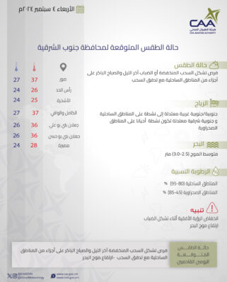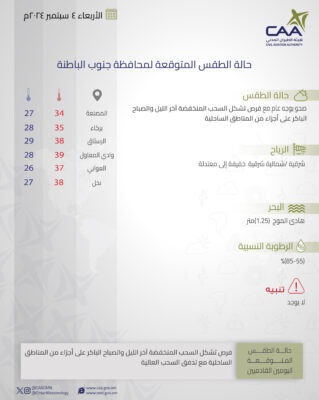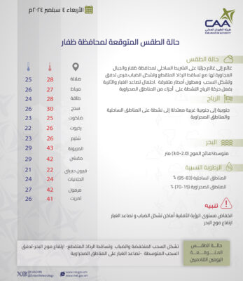 نشرت الأرصاد الجوية العمانية حالة الطقس المتوقعة غداً الأربعاء في محافظات جنوب الباطنة وشمال الباطنة البريمي والوسطى و مسندم ومسقط ظفار.