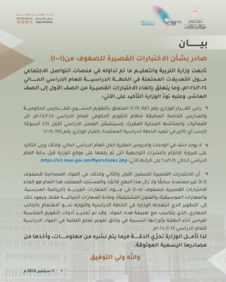 – أن الاختبارات القصيرة للصفين الأول والثاني وكذلك في المواد المصاحبة للصفوف (١-٤) غير معتمدة سابقًا ولا زال هذا النهج قائمًا، والمستجد المعتمد هذا العام هو إلغاء الاختبارات القصيرة للصفوف (٥-١٠) في مواد المهارات الفردية الرياضة المدرسية، والمهارات الموسيقية، والفنون التشكيلية)، ومادة المهارات الحياتية فقط، ويعود ذلك إلى التطوير الذي انتهجته الوزارة في الخطة الدراسية والتوجه نحو الاهتمام بالجانب المهاري، الذي يتناسب مع طبيعة هذه المواد. وقد تم تحديد أدوات التقويم المناسبة لقياس أداء الطلبة وأوزانها النسبية في وثائق تقويم تعلم الطلبة في المواد الدراسية للعام الدراسي ٢٠٢٤/ ٢٠٢٥م. لذا تأمل الوزارة تحرّي الدقة فيما يتم نشره من معلومات، وأخذها من مصادرها الرسمية الموثوقة.