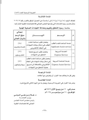 أصدر المجلس العماني للاختصاصات الطبية قرار رقم ٢٠٢٤/٢٦ بتعديل بعض أحكام القرار رقم ۱۳ / ۲۰۲۲ بشأن تحديد رسوم الخدمات التي يقدمها المجلس العماني للاختصاصات الطبية وللمزيد من التفاصيل أدناه :