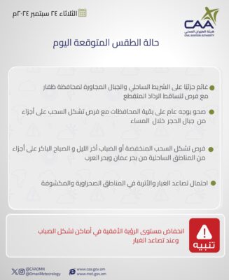 اصدرت الارصاد الجوية ملخص حالة الطقس لليوم كما هو موضح ادناه :