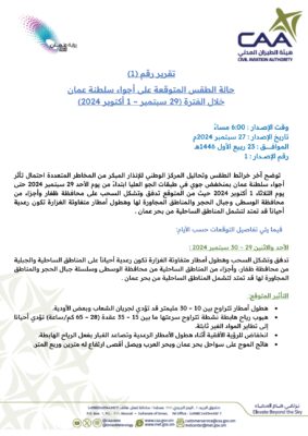 أصدرت الارصاد الجوية العمانية التقرير الاول للحالة الجوية المتوقعة حيث توضح آخر خرائط الطقس وتحاليل المركز الوطني للإنذار المبكر من المخاطر المتعددة احتمال تأثر أجواء سلطنة عمان بمنخفض جوي في طبقات الجو العليا ابتداءً من يوم الأحد 29 سبتمبر 2024 حتى يوم الثلاثاء 1 أكتوبر 2024 حيث من المتوقع تدفق وتشكل السحب على محافظة ظفار وأجزاء من محافظة الوسطى وجبال الحجر والمناطق المجاورة لها وهطول أمطار متفاوتة الغزارة تكون رعدية أحياناً قد تمتد لتشمل المناطق الساحلية من بحر عمان .