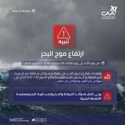نبهت الأرصاد الجوية العمانية من ارتفاع موج البحر إلى متوسط/ هائج الموج (1.5-2.5)متر على سواحل بحر عمان وسواحل بحر العرب خلال اليوم الأحد 29 سبتمبر وحتى الثلاثاء 1أكتوبر 2024