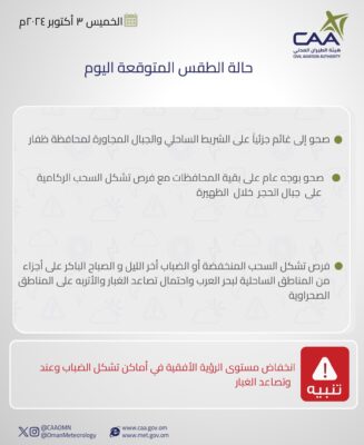 وهج الخليج - مسقط أصدرت الارصاد الجوية العمانية ملخص حالة الطقس لليوم كما هو موضح ادناه :