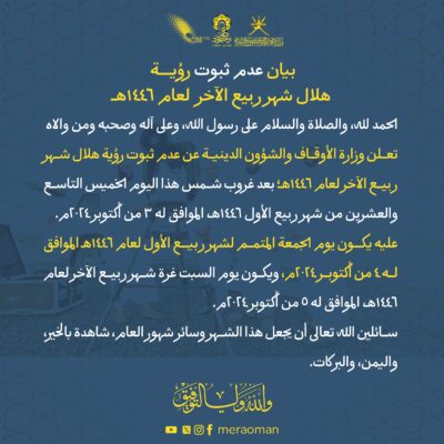 ذكرت وزارة الأوقاف والشؤون الدينية أته لم يتم ثبوت رؤية هلال شهر ربيع الآخر لعام 1446هـ، وعليه يكون يوم غدٍ الجمعة المُتمّم لشهر ربيع الأول لعام 1446هـ.