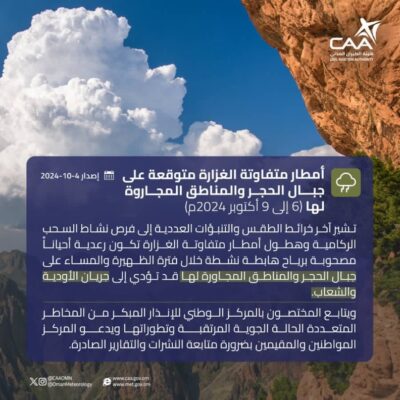 توقعات بأمطار متفاوتة الغزارة على جبال الحجر خلال الفترة من 6-9 أكتوبر