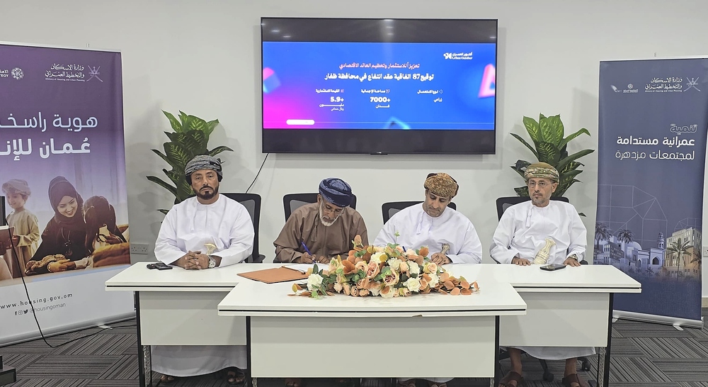 وقّعت وزارة الإسكان والتخطيط العمراني ممثلة بالمديرية العامة للإسكان والتخطيط العمراني بمحافظة ظفار اليوم على 87 عقد انتفاع زراعي في المحافظة على مساحة إجمالية تتجاوز 7 آلاف فدان، بقيمة استثمارية تقدّر بـ 6 ملايين ريال عُماني.