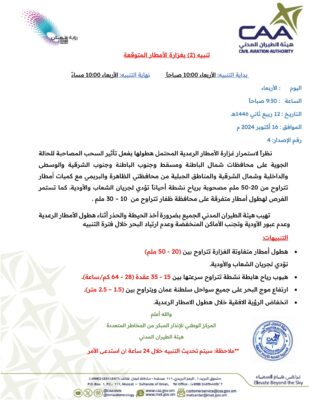 أصدرت الارصاد الجوية العمانية تنبيه رقم ٢ فيما يلي نصه : نظراً لاستمرار غزارة الأمطار الرعدية المحتمل هطولها بفعل تأثير السحب المصاحبة للحالة الجوية على محافظات شمال الباطنة ومسقط وجنوب الباطنة وجنوب الشرقية والوسطى والداخلية وشمال الشرقية والمناطق الجبلية من محافظتي الظاهرة والبريمي مع كميات أمطار تتراوح من 20-50 ملم مصحوبة برياح نشطة أحياناً تؤدي لجريان الشعاب والأودية. كما تستمر الفرص لهطول أمطار متفرقة على محافظة ظفار تتراوح من 10 – 30 ملم .
