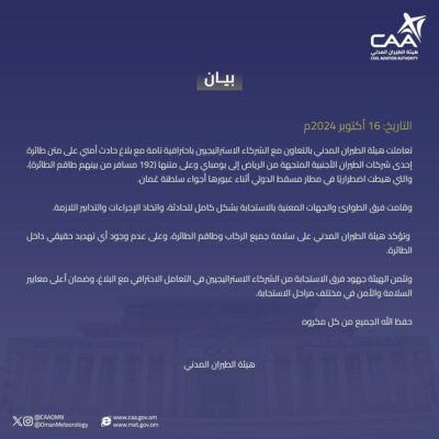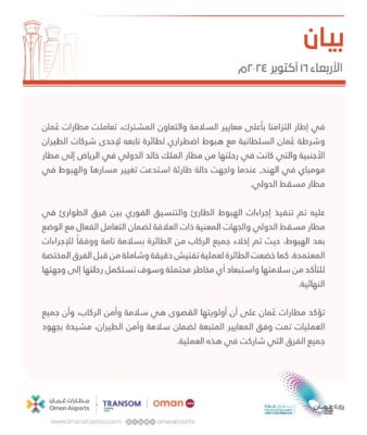 تعاملت هيئة الطيران المدني بالتعاون مع الشركاء الاستراتيجيين باحترافية تامة مع بلاغ حادث أمني على متن طائرة إحدى شركات الطيران الأجنبية المتجهة من الرياض إلى بومباي وعلى متنها (192) مسافر من بينهم طاقم الطائرة)، والتي هبطت اضطراريًا في مطار مسقط الدولي أثناء عبورها أجواء سلطنة عمان.